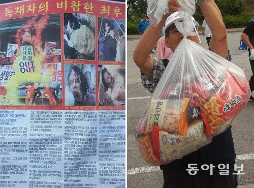 25일 보수단체 자유북한운동연합이 경기 김포에서 살포한 대북전단에는 '독재자의 비참한 최후'라는 제목과 함께 악명 높았던 공산권 독재자인 니콜라에 차우셰스쿠 전 루마니아 대통령이 총살당한 사진 등과 함께 북한 주민에게 전하는 말이 새겨져 있다(왼쪽 사진). 올해 6월 임진각에서는 대한민국어버이연합과 탈북난민인권연합이 대북전단이 아닌 초코파이, 새우깡 등의 음식류를 북에 날려 보냈다. 파주=황성호 hsh0330@donga.com / 백연상 기자 |