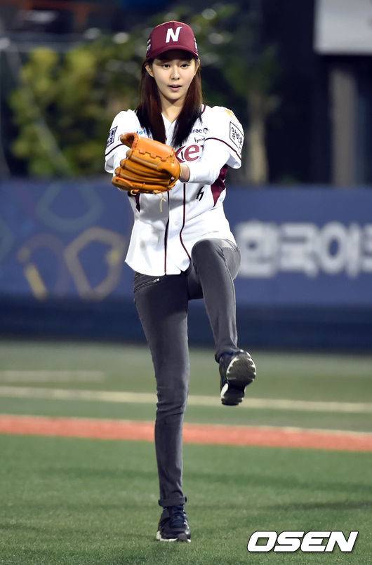 [OSEN=목동,손용호 기자] 28일 오후 서울 목동구장에서 열린 한국야쿠르트 세븐 프로야구 플레이오프 2차전 넥센과 LG의 경기에 앞서 인기 걸그룹 애프터스쿨의 유이가 멋진 폼으로 시구를 하고 있다. 유이는 넥센 2군 김성갑 감독의 딸이다.