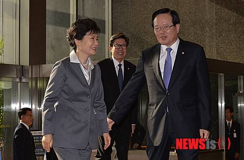 【서울=뉴시스】김영욱 기자 = 박근혜 대통령이 29일 오전 서울 여의도 국회의사당을 방문, 정의화 국회의장의 영접을 받고 있다. 2014.10.29.