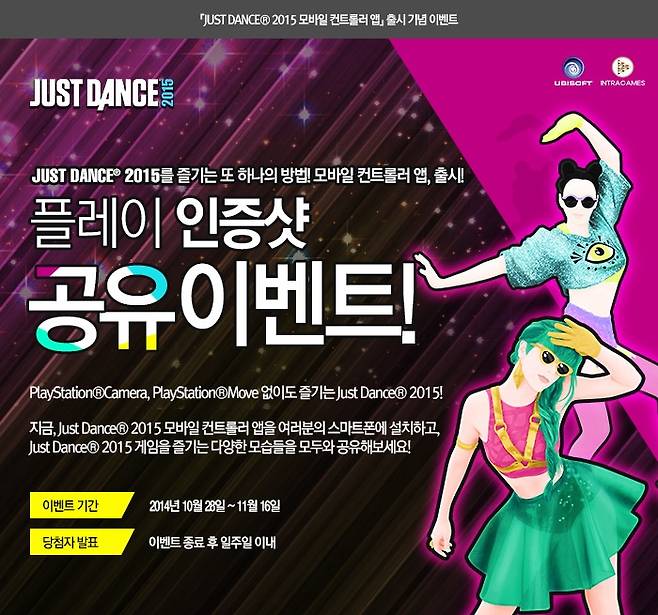 인트라게임즈는 '저스트 댄스 2015 모바일 컨트롤러 앱'의 출시를 기념하여 플레이 인증샷 공유 이벤트를 진행한다. 이벤트 기간은 오는 11월 16일까지이며, 추첨을 통해 선정된 게이머에게는 '저스트댄스 야광 안경', '저스트댄스 토트백', '인트라게임즈 발매 타이틀' 등을 경품으로 받을 수 있다.