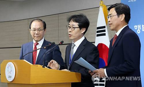 (세종=연합뉴스) 배재만 기자 = 김성훈 한국교육과정평가원 원장이 31일 오전 정부세종청사 합동브리핑룸에서 열린 지난해 대학수학능력시험 세계지리 8번 문항 출제오류 판결과 관련한 기자회견에서 질문에 답하고 있다.왼쪽은 황우여 교육장관, 오른쪽은 한석수 교육부 대학지원실장. 2014.10.31