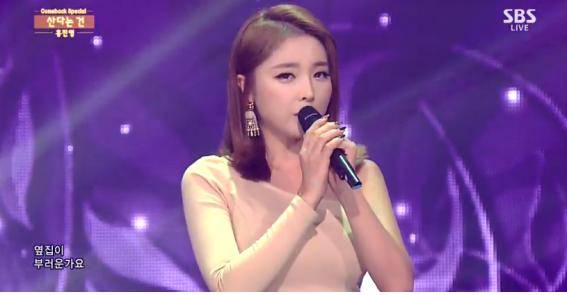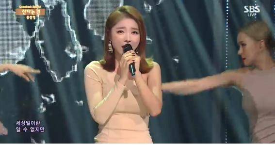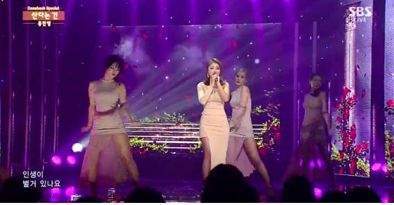 홍진영은 2일 오후 방송된 SBS '인기가요'에서 신곡 '산다는 건'으로 매혹적인 무대를 꾸몄다. 스킨톤 치마를 입고 나온 홍진영은 단정한 헤어스타일과 어우러지면서 청순한 매력을 발산했다.