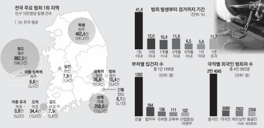 특히 제주에서 발생한 절도 범죄는 982.5건으로 가장 많았고, 아동 성폭력 범죄 또한 제주가 6.6건으로 발생 빈도가 가장 높았다. 지난해 전국에서 발생한 아동 성폭력 사건 1051건 가운데 34.1%는 가해자가 이웃이나 친족, 지인, 친구 등 평소 피해자와 아는 사이인 것으로 드러났다.