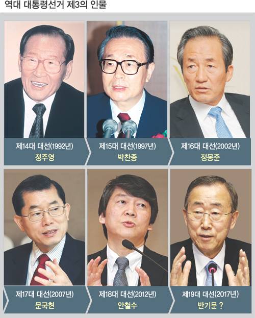 대표적인 제3의 후보는 고(故) 정주영 현대그룹 명예회장이다. 정 회장은 1992년 제14대 대선에서 '경제대통령', '통일대통령'을 외치며 대선에 출마했다. 현대건설 설립자인 정 회장의 '반값 아파트' 공약은 서민 마음을 사로잡았다. 하지만 '경제와 정치권력을 다 잡으려 한다'는 비판과 반기업정서의 역풍을 불러 3위로 낙선했다.
