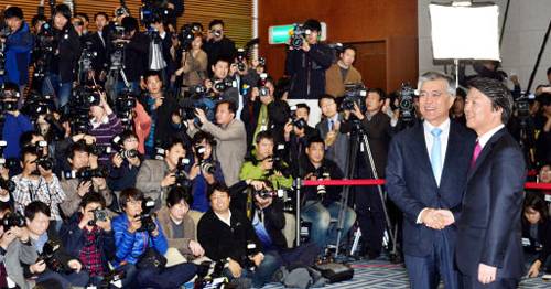 | 18대 대선을 한 달여 앞둔 2012년 11월 6일 야권 후보단일화 논의에 나선 민주통합당 문재인(오른쪽 두 번째), 무소속 안철수 대선후보가 서울 백범기념관에서 만나 악수하고 있다. 안 후보는 단일화 협상 과정에서 진통을 겪은 뒤 후보직을 사퇴했다.세계일보 자료사진 |