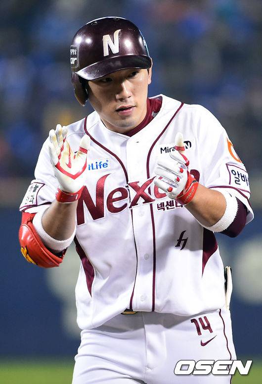 [OSEN=잠실, 박준형 기자] 11일 오후 서울 잠실야구장에서 열린 '2014 한국야쿠르트 세븐 프로야구 포스트시즌' 삼성 라이온즈와 넥센 히어로즈의 한국시리즈 6차전,4회말 넥센 선두타자 서건창이 안타를 날리고 박수를 치고 있다.