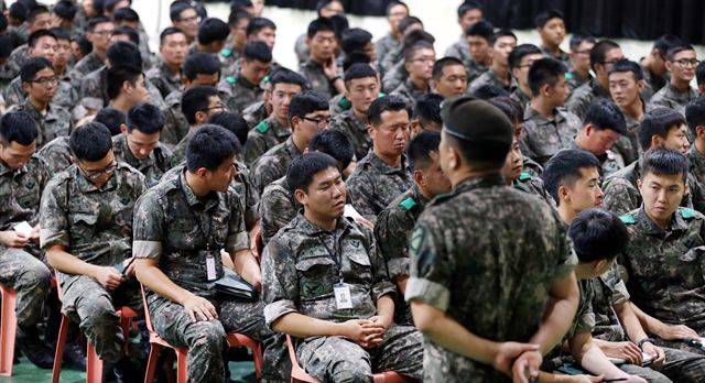 병사들의 계급을 일원화 하는 방안이 논의되고 있다. 사진은 지난 8월 육군 30기계화보병사단 장병들이 특별인권교육을 받기위해 강당에 모여 있는 모습. 한국일보 자료사진