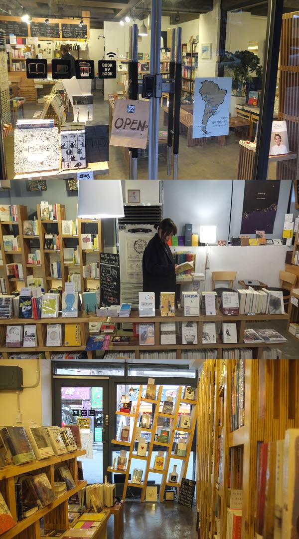 | (위부터) 서울 상암동의 동네서점 북바이북 본점 외부. 본점 내부. 소설점 내부. |