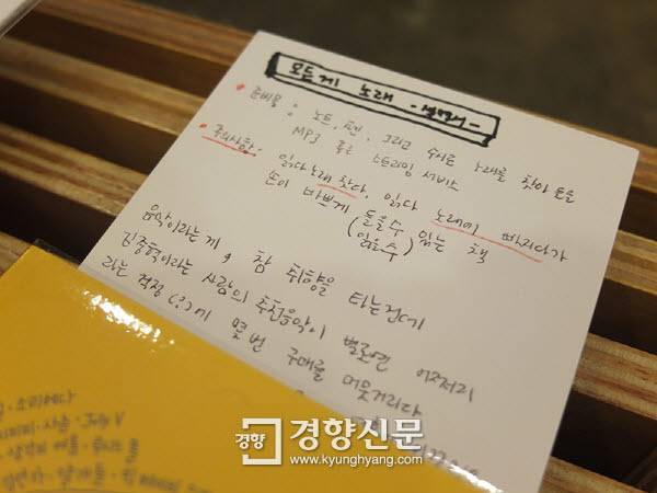 서가 분류도 독특하다. 소설점의 한 책장에는 미야베 미유키 장편 <솔로몬의 위증>, 김중혁 에세이 <뭐라도 되겠지>, 닉 페어웰 장편 <go>, 요네하라 마리 장편 <올가의 반어법> 등 책등이 흰색인 책들만 꽂혀 있다. 서가 아래에는 '깔끔한 책등만 모았지요'라는 꼬리표가 붙어 있다. 자매는 이 꼬리표를 '책장꼬리'라고 부른다. '노란 책들만 모아봤어요'라는 책장꼬리도 있다. 요네하라 마리 에세이 <인간수컷은 필요없어>, 한승원 장편 <겨울잠, 봄꿈>, 히가시노 게이고 장편 <둘 중 누군가 그녀를 죽였다>처럼 책등이 노란색이라는 점을 제외하면 아무런 공통점이 없는 책들이 꽂혀 있다. 책장꼬리 이외에 '책꼬리'도 있다. 책꼬리는 손님들이 책에 대한 짤막한 감상을 적어 책 사이에 책갈피처럼 꽂아놓은 것이다. 책꼬리는 무슨 책을 살지 결정하지 못한 사람들에게 하나의 입소문으로 작용해 책 구매를 유도하는 역할을 한다. 책꼬리를 적는 손님에게는 커피를 무료로 내준다.
