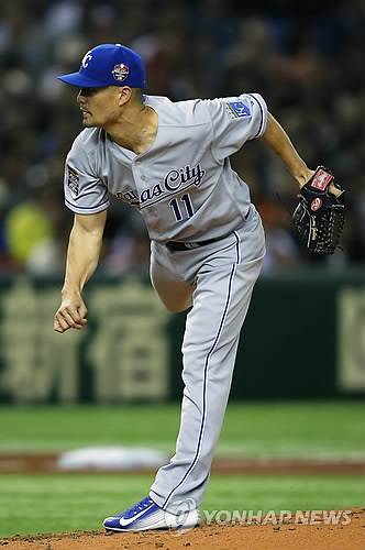 epa04490864 MLB All-Stars' starting pitcher Jeremy Guthrie of the Kansas City Royals pitches in the first inning during the third game of the 2014 Major League Baseball (MLB) Japan All-Star Series at Tokyo Dome in Tokyo, Japan, 15 November 2014. EPA/KIYOSHI OTA