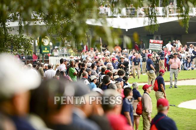 November 15, 2014. Crowd around the 18th green. The finishing group with leader Christina Kim approachs. Lorena Ochoca Invitational Golf Tournament, Mexico City, Mexico.