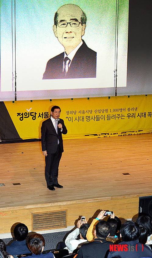 【서울=뉴시스】박문호 기자 = 박원순 서울시장이 27일 오후 서울 성동구 고산자로 성동청소년수련관에서 열린 정의당 서울시당 '박원순 시장 초청 강연회'에서 '서로 다른 이해관계의 시민 고민을 몇 년 더 들으면 이렇게 될 것'이라며 대머리가 된 자신의 그림을 선보이고 있다. 2014.11.27.
