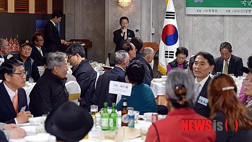 【서울=뉴시스】박영태 기자 = 28일 서울 세종문화회관 홀에서 열린 (사)물망초 주최의 우리 시대 영웅들과의 대화 '국군포로 어르신 초청 오찬 간담회'에서 김현 국군포로송환위원장이 개회사를 하고 있다. 2014.11.28.