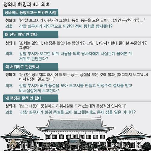 청와대는 '감찰보고서'가 아니라 '동향보고서'라고 한다. 민경욱 청와대 대변인 설명대로라면 보고서는 시중에 떠도는 풍문을 모은 것이다. 하지만 공직기강비서관실이 이런 일을 할 이유는 없다. 청와대는 지난 24일 본지가 정씨 관련 의혹을 첫 보도할 당시만 해도 "공직기강비서관실은 공직자를 감찰하는 곳"이라고 해명했다. 본인들 스스로 공직자 감찰을 하는 부서라는 입장을 내놨으면서 불과 나흘 만에 '풍문을 모아서 보고하는' 조직으로 만들었다. 조순형 전 의원은 "공직기강비서실이 무슨 찌라시를 모아서 보고하는 곳이라는 해명 자체가 말이 되지 않는다"고 지적했다.
