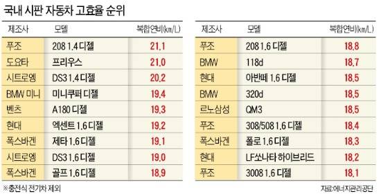 현재 국내에 판매되는 차종 가운데 에너지효율이 가장 뛰어난 모델은 푸조 208 1.4 디젤이다. <표 참조> 그 다음은 도요타 프리우스, 시트로엥 DS3 1.4 디젤, 미니쿠퍼, 벤츠 A180 디젤 순이다. 국산차 중에선 수동변속기 기준 현대차 엑센트 1.6 디젤이 19.2㎞/L로 가장 우수하다. 아반떼 1.6 디젤과 르노삼성 QM3 등도 연비가 뛰어난 편이다.