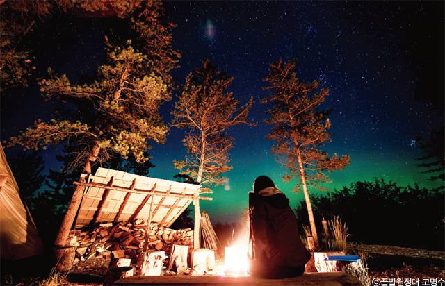 모닥불가에 모여 추위를 참으며 기다리고 있으니 지평선 위로 초록색의 띠가 춤을 추며 떠오르기 시작했다. "오로라예요!" "오로라가 나타났어요" "저기다! 오로라다!" 탄성이 들려오고 너도나도 기뻐하며 바라보는 오로라는 말로는 표현이 안 될 만큼의 벅참을 선사했다. 한참을 오로라의 신비함과 아름다움에 취해 멍하니 바라만 보았다. '정말 내가 오로라를 보게 되다니, 이게 꿈이야 생시야.'
