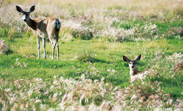 초원에서 쉬고 있는 뮬사슴Mule Deer들. 유콘의 광할한 툰드라 지대에는 다양한 야생동물들이 살고 있어서 사파리가 가능하다