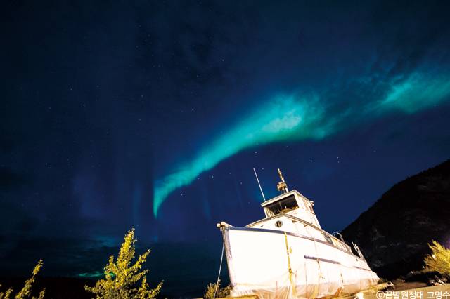 도슨시티 또한 오로라를 볼 수 있는 최적의 장소라고 했다. 하지만 도슨시티에 내리자마자 비가 내려 오로라에 대한 기대를 일찌감치 접었는데 행운의 여신은 역시 나의 편. 도슨시티에서는 골드러시 때 실제 금을 나르던 선박 위로 일렁이던 아름다운 오로라를 볼 수 있었다. 아직 강이 얼지 않았을 때라서 노란 단풍과 강에 비친 오로라 반영사진을 함께 촬영할 수 있었다.