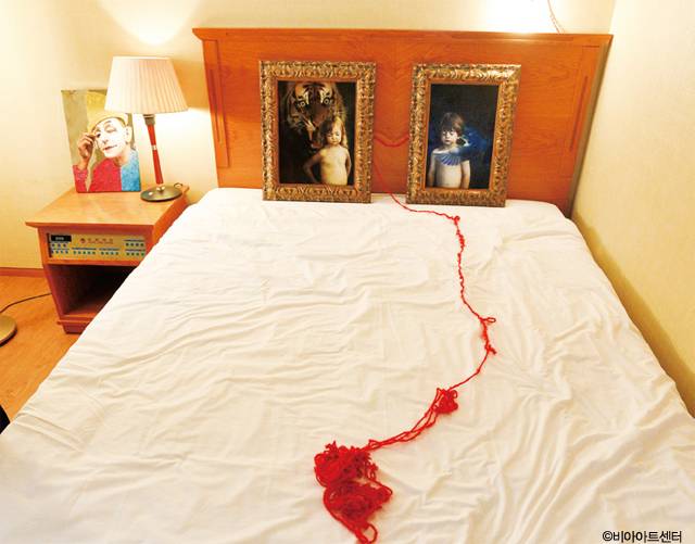 침대가 전시공간으로 사용됐다. 섬 썸 삶 아트페어에서 대동호텔에 전시된 김소연 작가의 작품