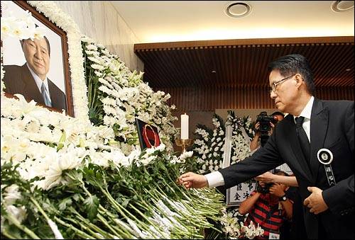 | ▲ 박지원 의원이 2009년 8월 19일 밤 서울 신촌 세브란스병원 장례식장에 마련된 고 김대중 전 대통령 빈소에서 헌화하고 있다. |
