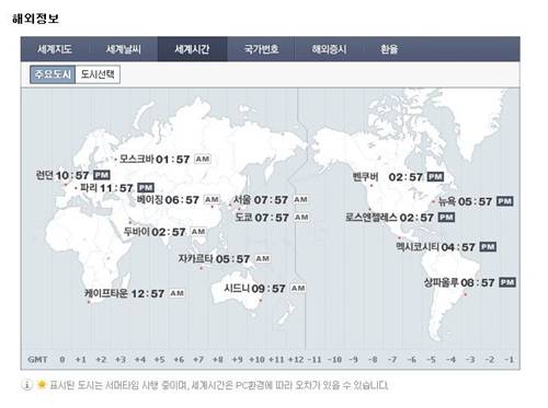 세계 주요도시의 현재시간을 확인할 때에는 네이버, 다음 등의 포털 사이트를 이용하면 된다. 검색창에서 '세계 시간'을 검색하면 주요 도시의 시각을 한눈에 표시하는 지도가 등장한다.