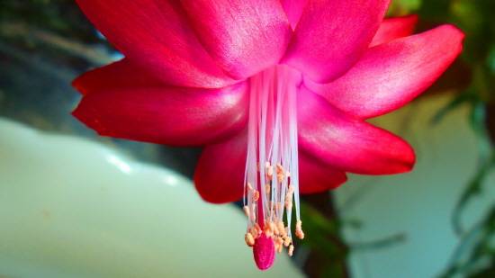 꽃은 12∼1월에 연분홍색으로 피고 어린줄기 마디에 1∼2개씩 옆을 향하여 달린다. 꽃의 지름은 8cm이고, 화피는 뒤로 말린다. 열매는 서양 배 같이 생기고 지름이 8cm이며 붉은 색으로 익는다(네이버 지식백과: 크리스마스캑터스 Christmas cactus 참조)."
