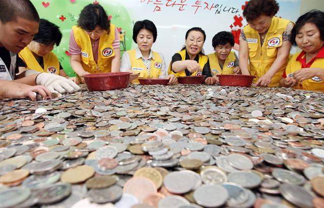 대한적십자사 인천지사 봉사원들이 공항이용승객들로부터 기부받은 동전을 수거해 분류하고 있는 모습. 한국일보 자료사진