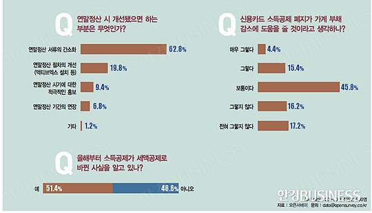 '13월의 보너스'라고 불리는 연말정산 시기가 다가왔다. 많은 직장인이 연말정산의 서류가 간소화됐으면 한다고 생각하고 있었다(62.8%). 액티브엑스 등 연말정산 절차의 개선(19.8%)도 필요하다고 답했다. 한편 올해부터 건별 소득공제가 세액공제 방식으로 바뀌면서 세금을 돌려받기보다 더 내야 하는 경우가 늘어날 전망이다. 이러한 세법 개정에 대해서는 51.4%만이 인지하고 있었다. 또 과소비와 가계 부채를 줄이기 위한 신용카드 소득공제 제한은 일몰 기한이 2년 더 연장됐다. 그러나 신용카드 소득공제 제한이 가계 부채를 줄이는 데 도움이 될 것으로 생각하는 이는 19.8%에 불과했다.