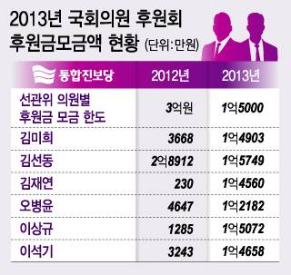최근 헌법재판소의 해산 결정이 내려진 통합진보당도 소속 의원들의 지난해 1인당 정치후원금은 새누리당과 민주당을 앞지른다. 특히 이석기 전 의원이 내란선동 혐의로 재판을 받는 등 당이 위기에 몰리자 오히려 후원이 더 몰렸다. 이 의원은 2012년 3243만원, 2013년 1억4658만원을 모았다. 김재연 전 의원은 2012년 230만원, 2013년 1억4560만원을 모금했다.