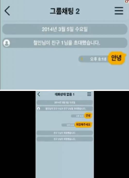 이 남성은 친구가 모르게 차단 여부를 알아낼 수 있는 다른 방법을 제시합니다. 우선 기존 친구를 두 명 초대를 한 뒤 모두 퇴장시킵니다. 말을 잘 듣는 친구 두 명이 있어야겠네요. 혼자 남은 이 단체 채팅방에서 의심이 가는 친구를 초대하면 됩니다. 이때 친구가 채팅방에 입장하지 않는다면 나를 차단한 겁니다.