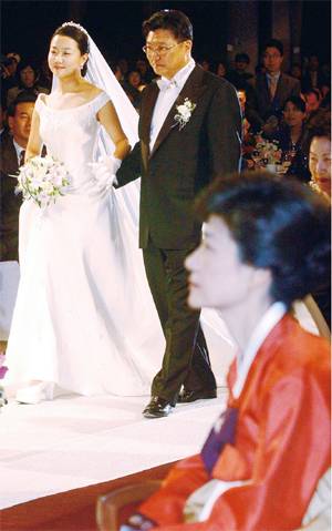 ↑박정희 전 대통령의 아들 박지만 EG 회장의 결혼식이 2004년 12월14일 서울 워커힐호텔에서 열렸다. 박회장의 누나인 박근혜 당시 한나라당 대표가 결혼식을 지켜보고 있다. ⓒ 사진 공동취재단