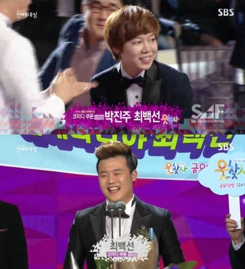 30일 서울 삼성동 코엑스 D홀에서 생방송으로 진행된 '2014 SBS 연예대상'(MC 이경규 성유리 배성재)에서는 '웃찾사-체인지' 박진주, '웃찾사-뿌리 없는 나무' 최백선이 코미디 부문 신인상을 수상했다.