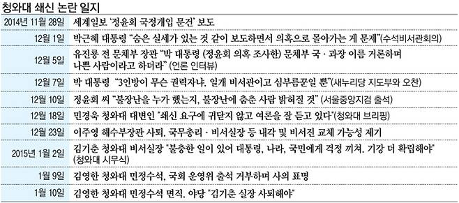 ◆ '비선실세' 공격 어떻게 피할까 박 대통령이 이와 관련해 인적 쇄신론에 대한 야권의 공세를 어떻게 피해갈지도 관심사다. 야권은 김영한 민정수석의 '항명 사퇴'를 김 실장 교체를 압박하는 계기로 몰고 가는 분위기다. 2·8 전당대회를 앞두고 이번 주말 첫 합동연설회에 나선 새정치민주연합 당권주자들이 모두 강도 높은 압박을 했다. 문재인 후보는 "민정수석 면직만으로 끝날 일이 아니라 김기춘 비서실장이 이번 일에 책임지고 사퇴해야 마땅하며 박근혜 대통령도 국민에게 사과해야 한다"고 강조했다. 김병준 국민대 교수(전 청와대 정책실장)는 "일국의 대통령이 사과한다는 것은 대안을 제시하고, 그 대안이 합리적이어서 국민이 진정성을 느낄 수 있어야 한다"고 강조했다.