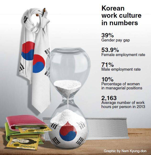 This unique corporate culture is one of the factors behind South Korea’s low employment rate among women, as well as its gender pay gap ― 39 percent ― being the highest in the OECD, experts say. Only about 10 percent of all senior or executive positions were held by women here while only 53.9 percent of all Korean women were employed last year.