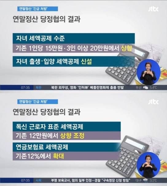 정부와 새누리당은 긴급 당정협의를 열고 출산공제 부활과 독신근로자·노후연금에 대한 세액공제를 확대하는 연말정산 보완책에 합의했다. 이번 연말정산 귀속분에 대해 소급적용하는 소득세법 개정안을 여야 합의에 따라 4월 국회에서 처리하기로 했다. 소급적용 시기는 올해 5월을 목표로 추진하기로 했다.
