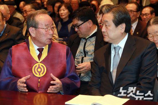 23일 오전 중구 태평로 프레스센터에서 열린 동학농민혁명 제120주년 기념 동학사상 확산 토론회에 참석한 새누리당 김무성 대표가 천도교 박남수 교령과 이야기를 하고 있다.