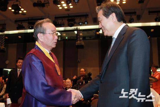 23일 오전 중구 태평로 프레스센터에서 열린 동학농민혁명 제120주년 기념 동학사상 확산 토론회에 참석한 새누리당 김무성 대표가 천도교 박남수 교령과 인사를 하고 있다.