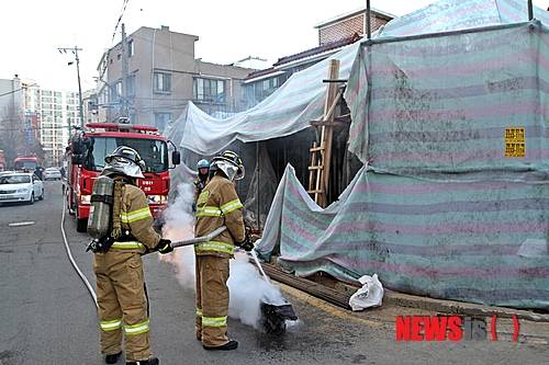 【서울=뉴시스】조수정 기자 = 서울 강동소방서(서장 이영우) 대원들이 27일 오후 4시 45분께 천호동 주택가 소재의 한 공사장에서 흰연기가 많이 발생한다는 신고를 받고 출동, 건축자재를 말리기 위해 공사장 내부에 피워놓은 모닥불을 외부로 빼내고 방수 및 안전조치 하고 있다. 2015.01.25. (사진=강동소방서 제공)