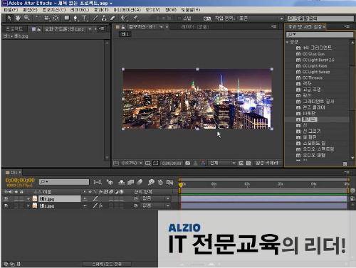 IT전문교육 알지오에서는 그래픽과 동영상 편집 등의 멀티미디어 관련 전문 강좌를 제공하고 있다. 실무 위주로 구성된 강의 덕분에 전문가들도 많이 찾고 있으며 수강생들의 호평이 끊이질 않고 있다. 그 중 하나인 에프터이펙트cc 또한 수강생들이 많이 찾고 있는 강좌이다.