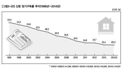 | ▲ 신문 정기구독율 추이(1996년~2014년). ⓒ한국언론진흥재단 | ||