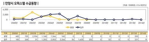 특히 디와이타운 주변은 주택재개발 및 주택재건축사업이 예정되어 있는 지역으로 오피스텔 공급이 전무하여 신축 오피스텔 선호도가 높은 지역임은 물론 2006년~2014년 9년간 안양시에 분양한 오피스텔은 250실이 전부이다.(아래 표 참조)