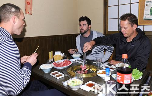 5일 휴식일을 맞아 KT 선수들이 모여 즐거운 저녁식사를 했다. 시스코, 필 어윈, 옥스프링이 모여 맛있게 저녁식사를 하고 있다.
