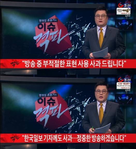 이날 엄성섭 앵커는 단독으로 등장해 "전날 방송에서 부적절한 표현을 사용한 점 사과드린다"라며 "앞으로 보다 신중한 방송을 하겠다"고 사과의 뜻을 전했다. 또한 "한국일보 기자께도 사과드린다"며 "정중한 방송하도록 하겠다"고 말했다.