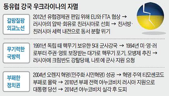 우크라이나의 외교정책이 전략적이지 못했던 것도 원인으로 꼽힌다. 야누코비치는 2012년 EU로부터 경제적 지원을 받는 대가로 FTA 협상에 착수했다. 하지만 2013년 러시아의 무력 제재와 경제적 지원을 이유로 이를 중단했다. 우크라이나가 다시 서방에서 러시아 편으로 간 것이다. 하지만 러시아는 망명한 야누코비치의 신변을 보호하면서 크림반도를 무력으로 강탈해 버렸다. 이후 친러시아와 친서방 세력의 갈등이 커지면서 내전으로 치달았고 나라가 동서로 분할될 위기에 놓였다.
