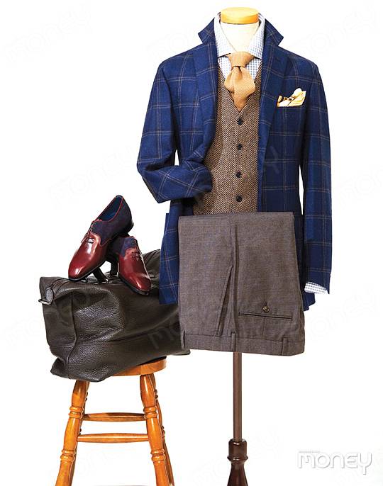 깅엄 체크 셔츠 98만 원·블루 타탄 체크 캐시미어 재킷 790만 원 모두 브리오니 오버 체크 팬츠 34만 원 브룩스 브라더스 타이 7만 원 루비나치 by 143E. 나폴리 플레인 토 구두 235만 원 오베르시 by 143E. 나폴리 브라운 빅 백 178만 원 보스