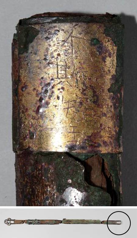 금관총에서 발굴됐던 둥근 고리 큰칼 끝(아래 사진 원 안)에서 2년 전 발견된 이사지왕(尒斯智王·위 사진)이란 글자. 이 때문에 금관총의 주인이 이사지왕일 수 있다는 주장이 나오고 있다. 국립중앙박물관 제공 |