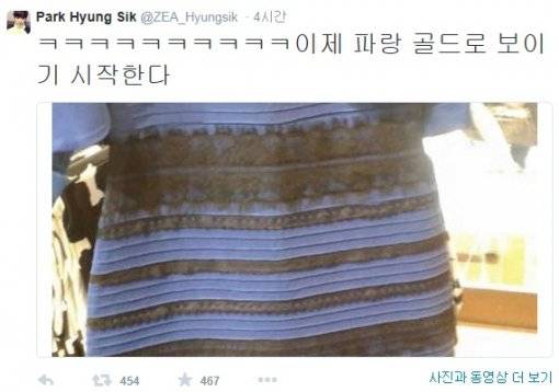 이런 가운데 가수 겸 배우 박형식은 27일 오후 자신의 트위터에 "나도 신기해서 봤는데 크게 보면 흰색 금색인데 사진을 작게 보면 파란색 검은색임..그래서 내눈은 뭔데"라는 글과 함께 해당 드레스 사진을 올리며 관심을 보였다.