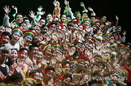 (서울=연합뉴스) 이지은 기자 = 지난 1년간 해외 84개국으로 파견돼 현지 문화를 체험한 국제청소년연합 소속 굿뉴스코 해외봉사단원들이 1일 오후 서울 송파구 올림픽공원 올림픽홀에서 귀국 콘서트를 하기 전 세계 각국의 전통의상을 입고 환하게 웃으며 포즈를 취하고 있다. 2015.3.1