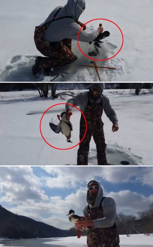잠시 뒤, 낚싯대가 있는 얼음구멍에 다다른 남성이 주저앉아 낚싯줄을 감아올린다. 큰 대어를 기대하며 감아올린 바늘에는 놀랍게도 물고기가 아닌 새 한 마리. 남성의 손에 매달려 퍼덕이는 물오리의 모습에 남성이 황당해 한다. 아마도 굶주렸던 물오리가 물고기 먹이를 찾기 위해 물속으로 들어갔다가 낚싯줄에 걸린 모양이다.