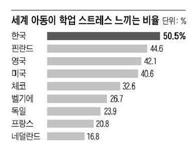 한국보건사회연구원 김미숙 연구위원이 한국아동종합실태조사와 유니세프(UNICEF) 자료를 비교 분석해본 결과, 우리나라 아동 두 명 중 한 명(50.3%)이 "학업으로 인해 스트레스를 받는다"고 답했다. 비교 조사 대상이 된 30개국 중 가장 높은 수치였다.
